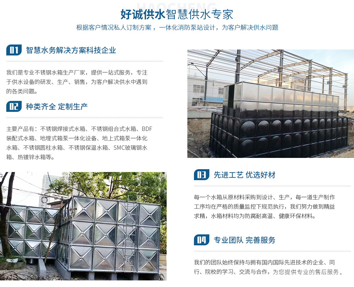 安徽好誠(chéng)供水設(shè)備制造有限公司是一家集設(shè)計(jì)、研發(fā)、制造、銷售、售后為一體的專業(yè)不銹鋼水箱生產(chǎn)廠家,以科技力量立足于社會(huì)。近幾年來(lái)致力于供水設(shè)備、水箱的研究與開(kāi)發(fā)。主要產(chǎn)品有:不銹鋼焊接式水箱、不銹鋼組合式水箱、BDF裝配式水箱、地埋式箱泵一體化設(shè)備、地上式箱泵一體化水箱、不銹鋼圓柱水箱、不銹鋼保溫水箱、SMC玻璃鋼水箱、熱鍍鋅水箱。對(duì)于傳統(tǒng)混凝土水箱的改造(即不銹鋼內(nèi)貼水箱),老舊水箱的拆除、更換、...